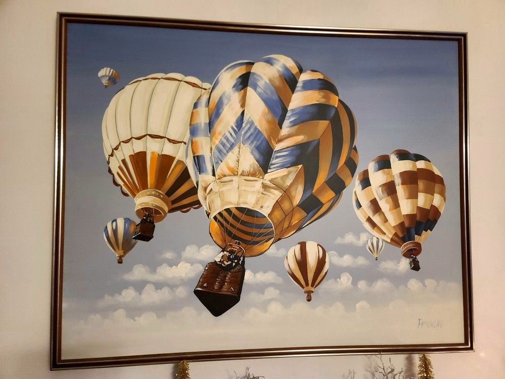 Vintage large-scale 5 FT x 4 FT framed painting of colorful hot air balloons floating above soft, fluffy clouds against a pale blue sky. The composition features one dominant central balloon in blue, gold, and cream chevron stripes, surrounded by several coordinating balloons in tan, rust, and cream tones, creating a sense of depth and motion. Signed by the artist in the lower right corner, this piece has a warm, nostalgic feel and would be perfect for a living room, office, or entryway with vintage, travel, or aviation-inspired decor metallic-toned frame 50 in x 62 inApproximately 4 ft 2 in x 5 ft 2 in