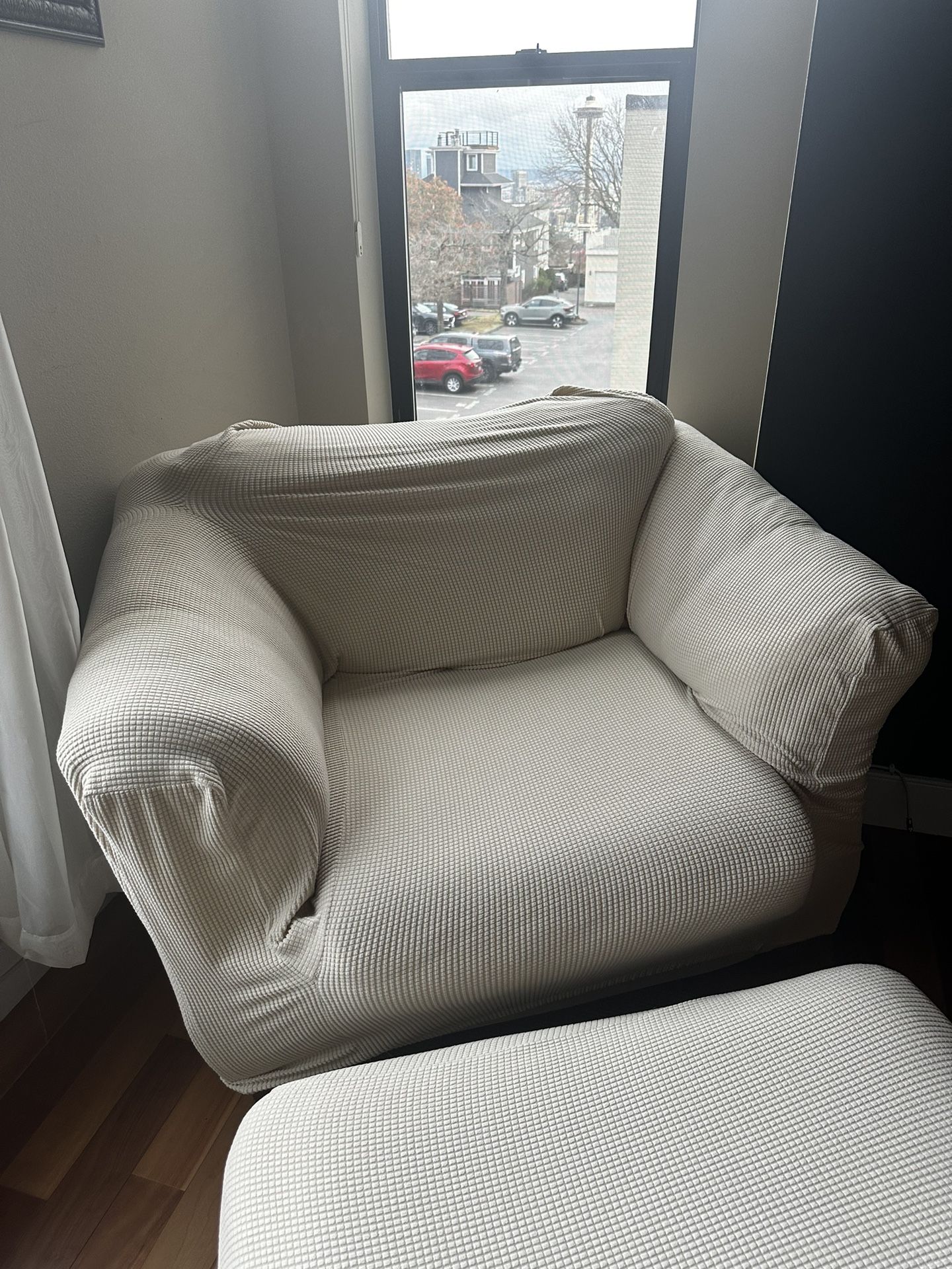 Large armchair and ottoman. These have slipcovers as shown in photos , as there’s significant wear and discoloration on the microsuede underneath. Originally purchased at Ashley furniture Pickup on Queen Anne Cash or Venmo only