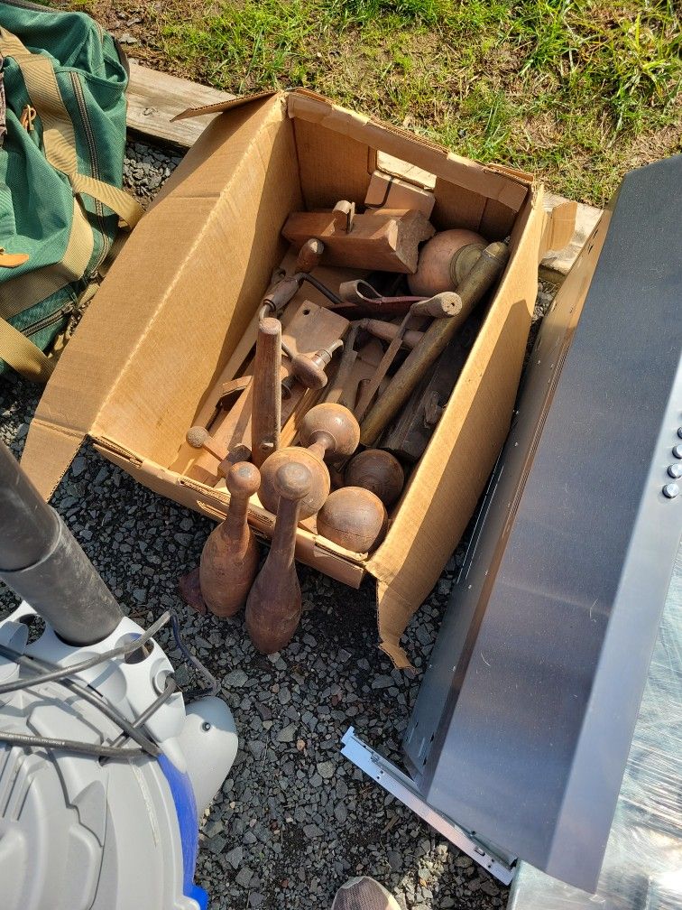 Box Of Old Tools And Juggling Pins Dumb Bells