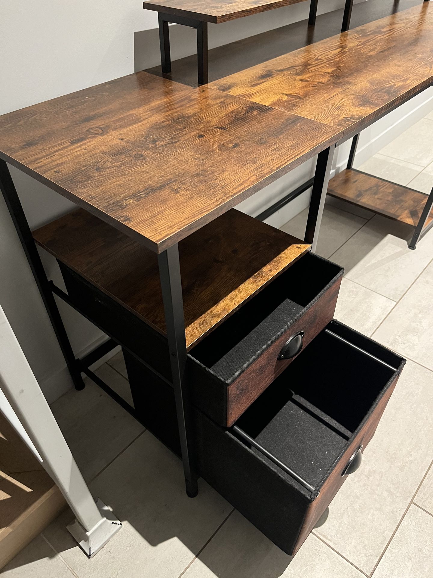 61” x 19” desk. Great condition with no scratches. Served me very well. Has cloth drawers. Bought off Amazon 3 years ago.
