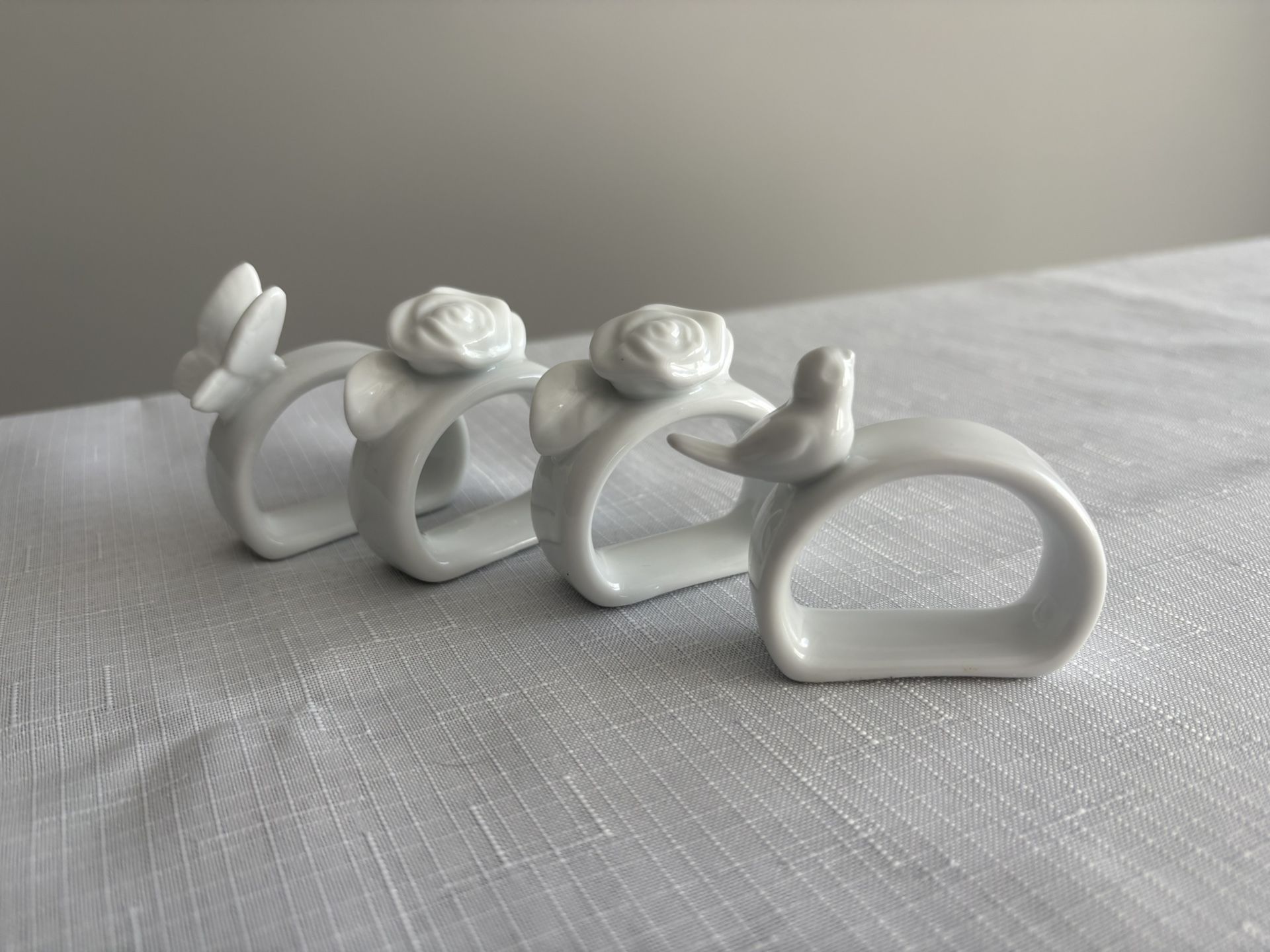 Porcelain Bird, Rose and Butterfly Napkin Rings x 4. Like new. No damage. Pickup in Northbrook near Lake Cook Rd and Waukegan Rd.