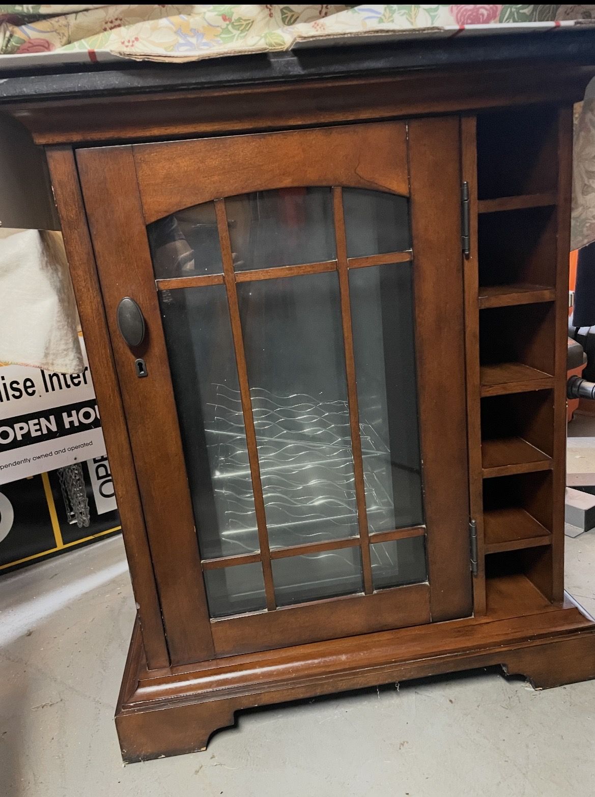 Wine cooler. Marble top. Solid wood. Condenser needs replacement. Can be used as wine storage.