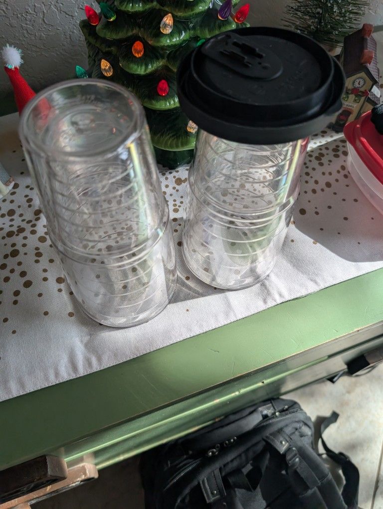 2 large tervis double walled insulated clear plastic cups. 1 large lid. 4 small tervis cups. 1 small lid.