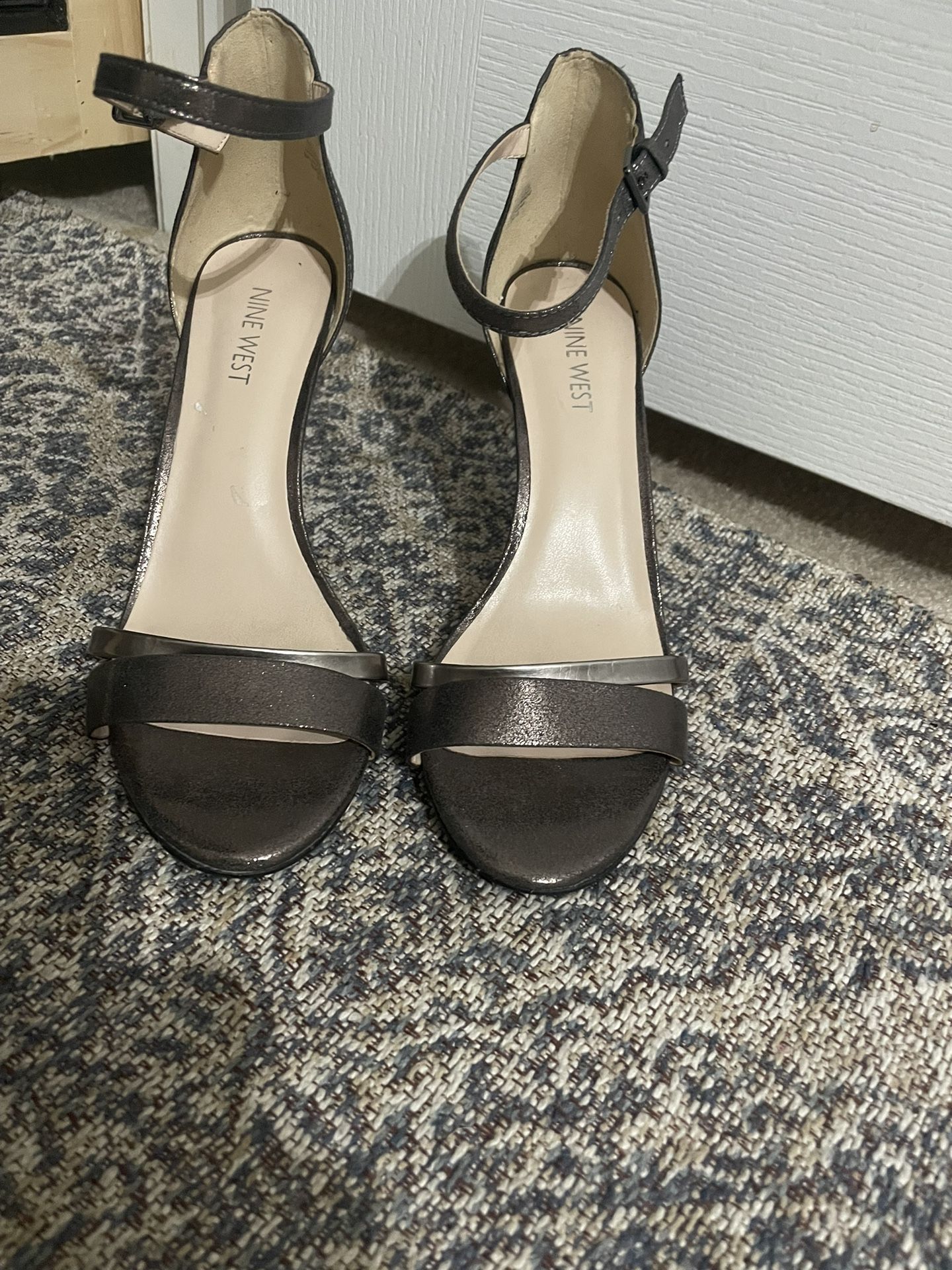Open toed high heels by NINE WEST. Pewter/Silver color. Size 8 1/2 Worn 1 time to a wedding. Cash only
