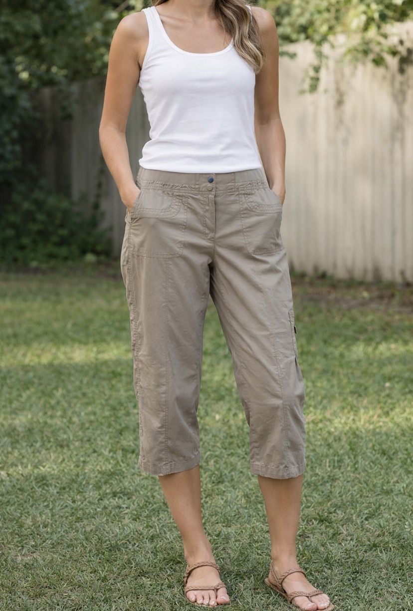 In excellent condition these Nice tan color women's lightweight cargo capri pants, likely designed for outdoor activities like hiking. They feature a zip fly with double-snap closure, front patch pockets, and side cargo pocket Size is 12 Inseam is 23 inches #7