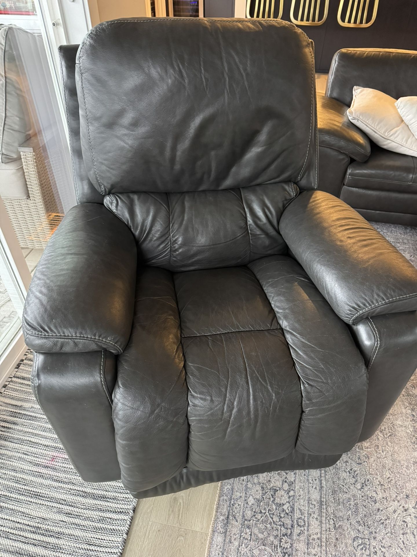 Greyish Black leather latzyboy recliner in very good shape. Works fine, no tears. This is 5 years old. No pets and a non smoking house. This is a very comfortable chair.
