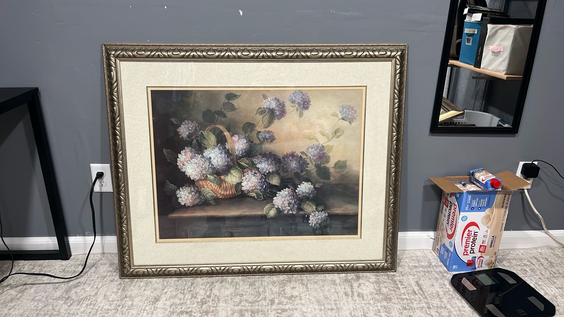 Purple/ blue hydrangeas in basket Frame is 42.5in x 34.5 Used condition