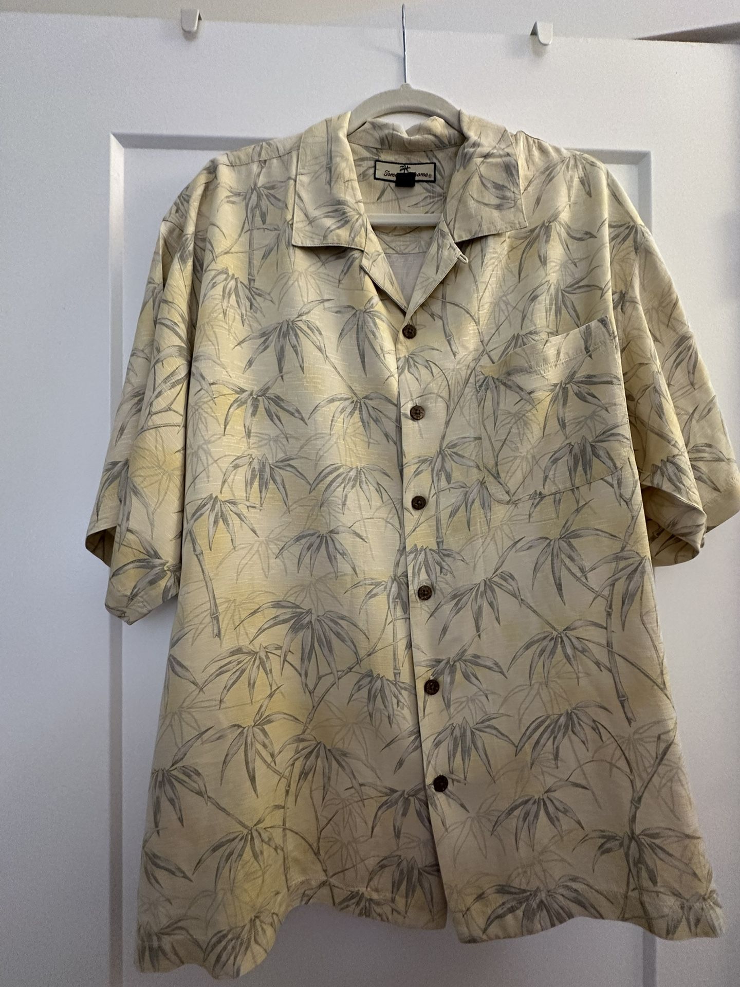 LOCAL PICK UP or IF SHIPPING REQUIRED, I SELL through EBAY as well. TOMMY BAHAMA Men's Hawaiian Shirt in size XL, made of 100% silk in a vibrant yellow color with a floral hibiscus star pattern. This button-up shirt features a collared neckline, spread collar style, short sleeves, and a relaxed fit, making it perfect for casual occasions in all seasons. The shirt is machine washable and part of the Island Zone product line by Tommy Bahama, adding a touch of Hawaiian theme to your wardrobe. Perfect for adding a pop of color and tropical flair to your outfit. Has been dry cleaned and ready for new home.