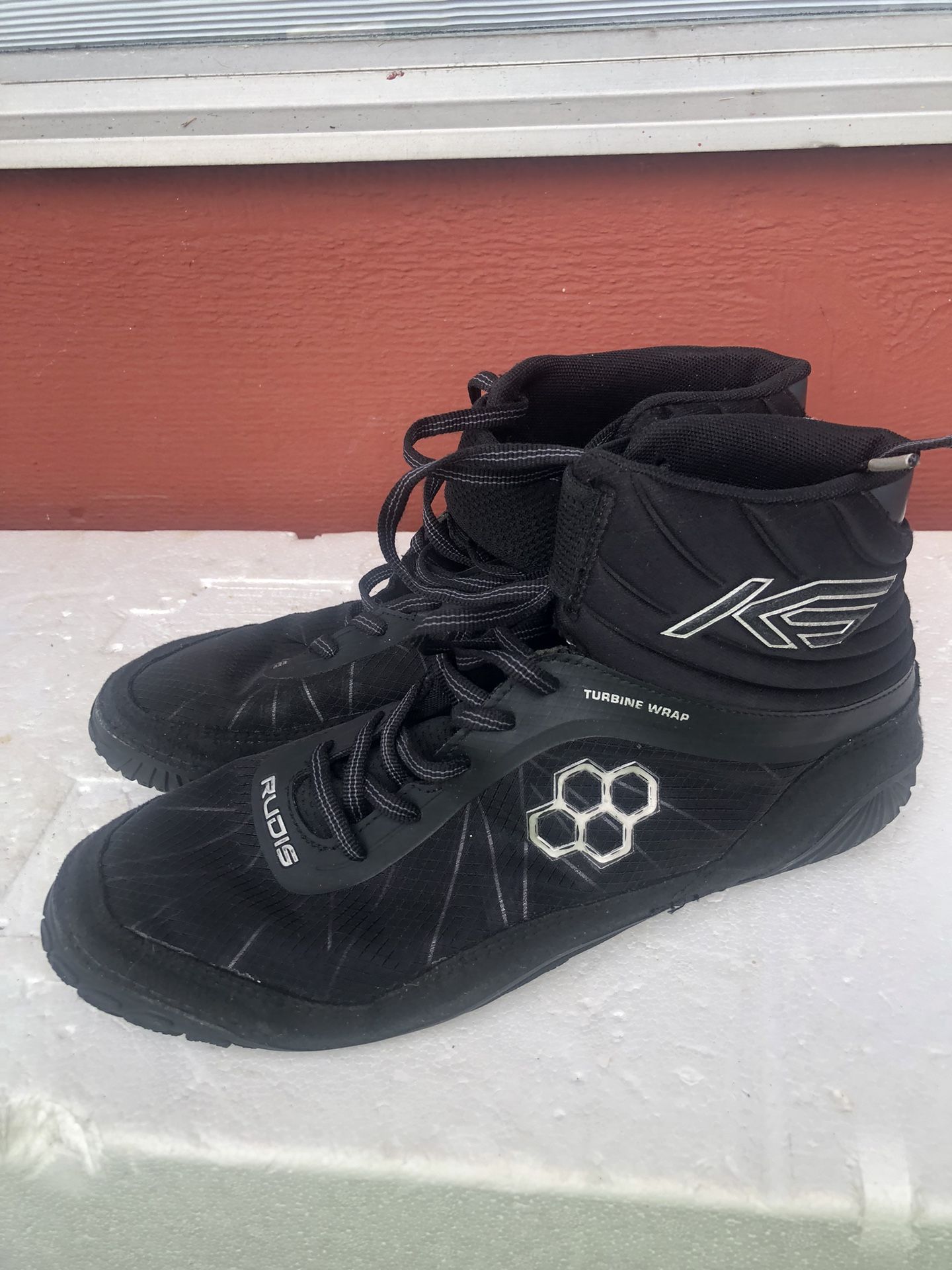 Rudis Rudis Turbine Wrap Wrestling Shoes Mens Black Gray Lace-Up Athletic Boots Sz 9. wrestling shoes in black with white accents. Features a sleek design and durable construction. G1-A6