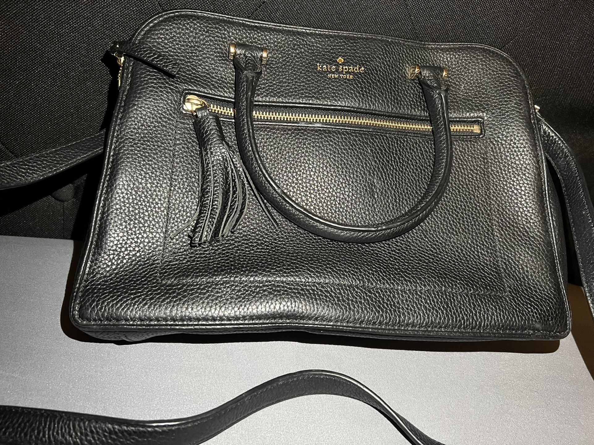 Good condition bag w/wallet. Color: Black with gold accents Pebbled leather. Wallet has many card slots and is in good condition as well.