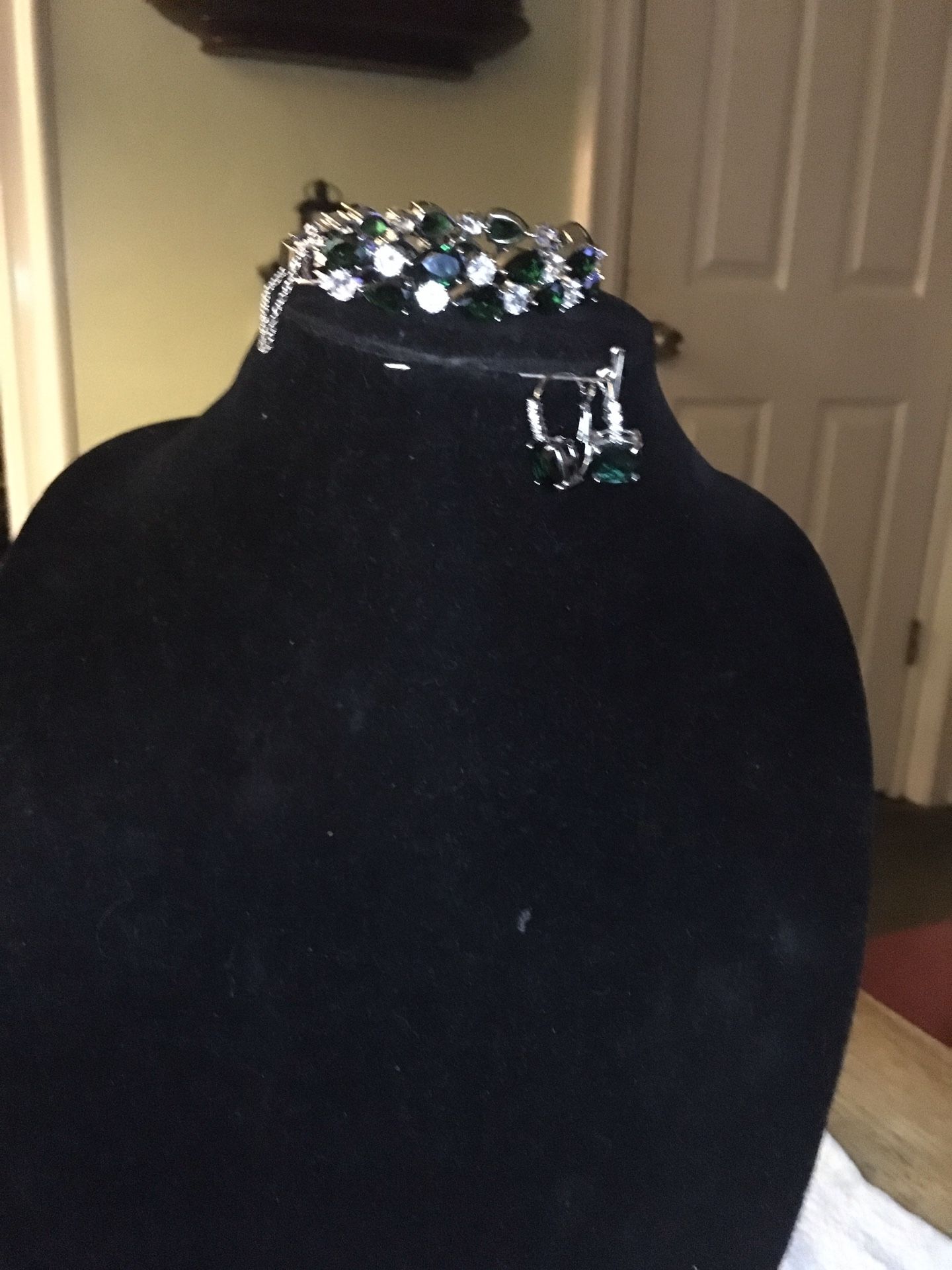 NEW LADIES PLATINUM PLATED GREEN CITRINE AND WHITE ZIRCON 6.8” BRACELET AND EARRING SET