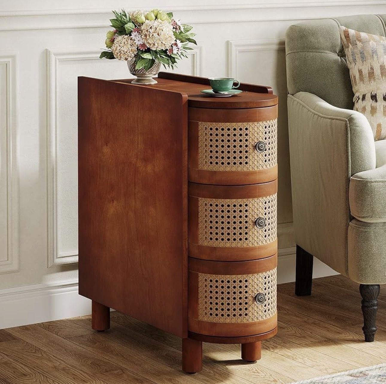 Tribesigns Solid Wood Side Table, 3 Drawer Rattan End Table, Nightstand with 3 Rattan Drawers and Exquisite Embossed Handles for Living Room, No Assembly Required (Walnut and oak Brand New still in the box D98