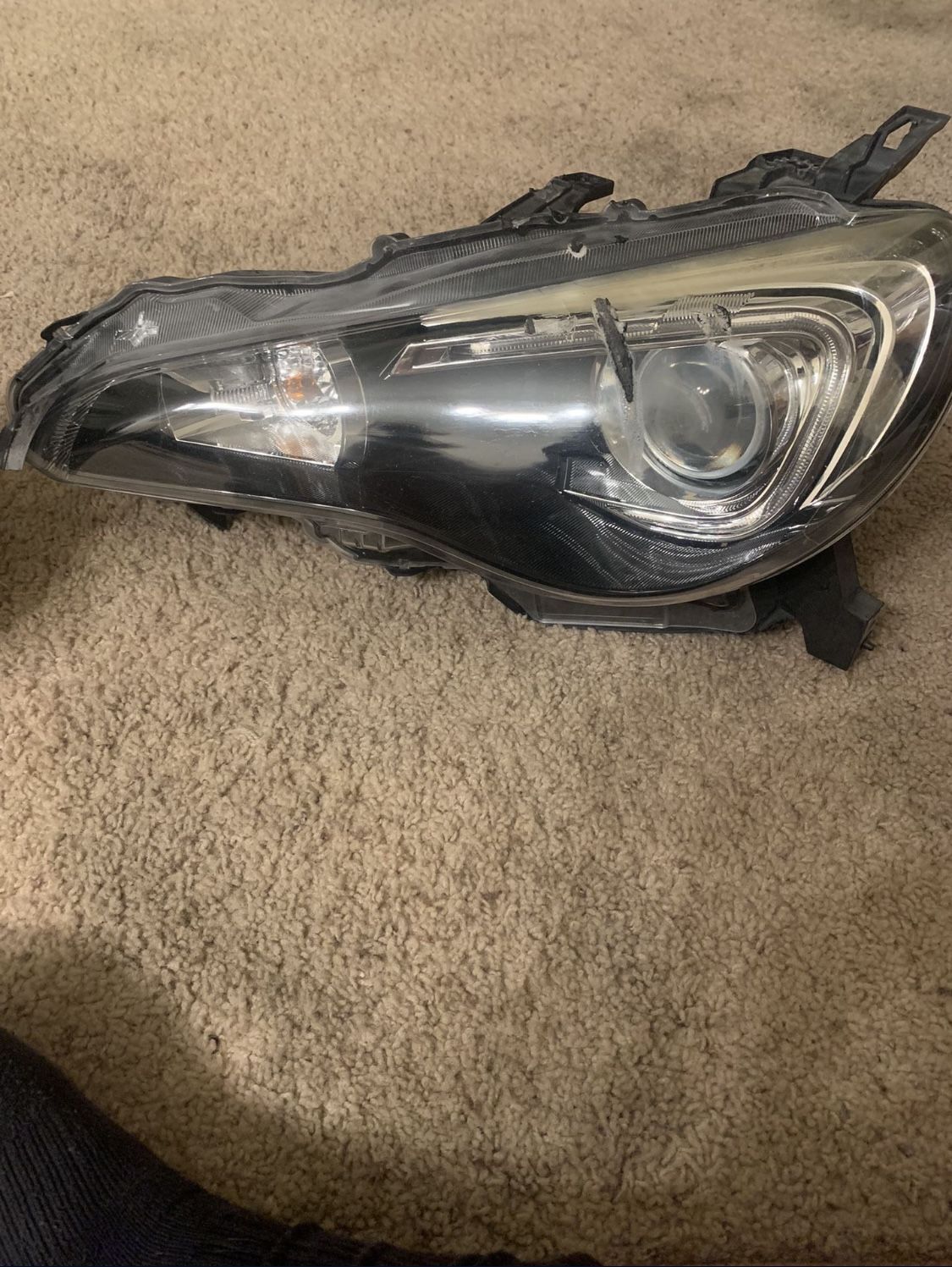 Driver side headlight. Original part that came off a 2016 BRZ. Has a gash on the lens but did not penetrate into housing. Still works like normal