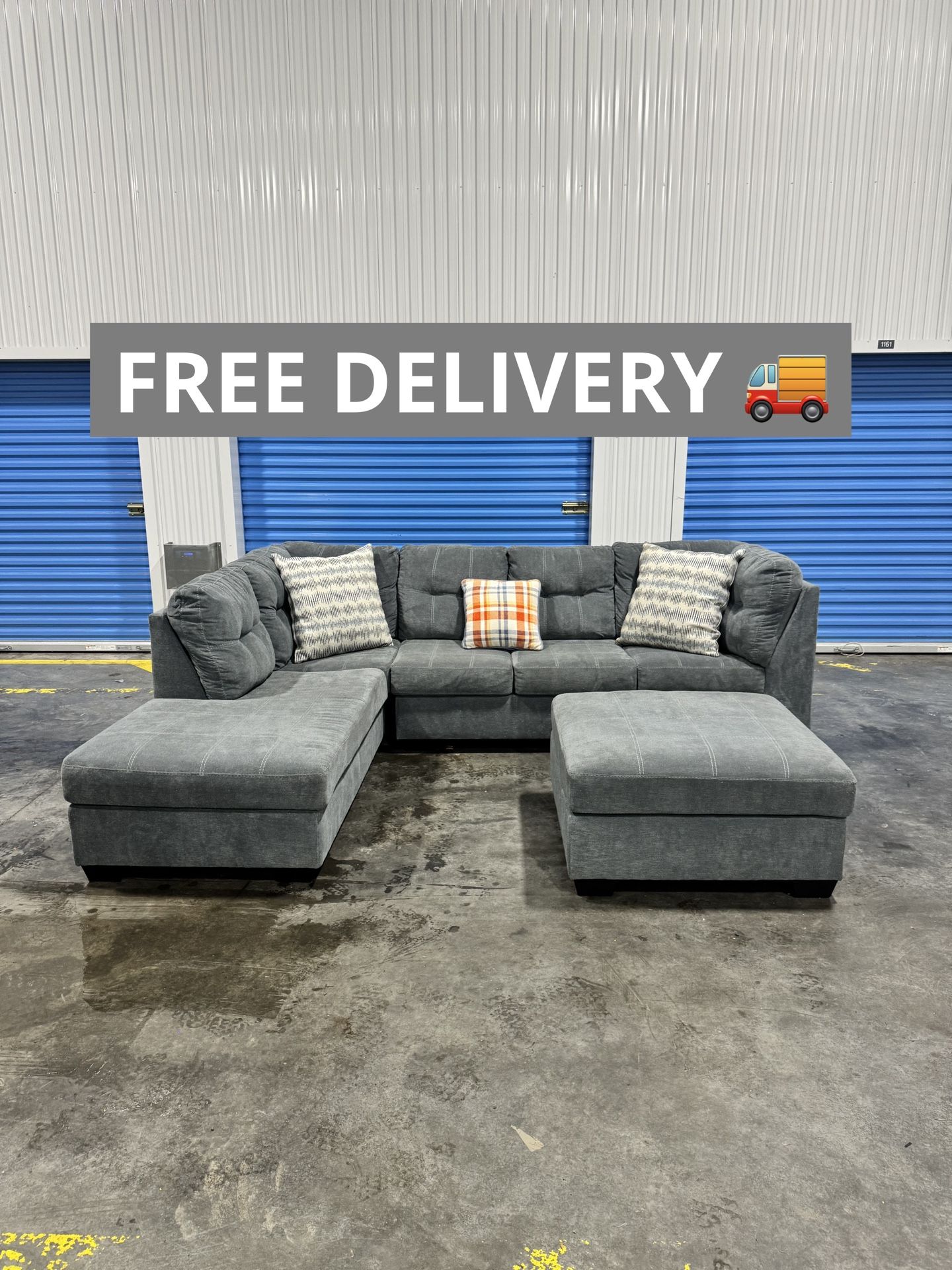 I’m offering free delivery on this beautiful Ashley’s sectional is in good! comes with ottoman! Comes in three pieces for easy loading through your front door! No rips or tears All bottom cushions are removable for easy washing Measures: 112” x 92” Comes from pet friendly home but is smoke free! I’m more than happy to offer free local delivery and help load into your home 🏡