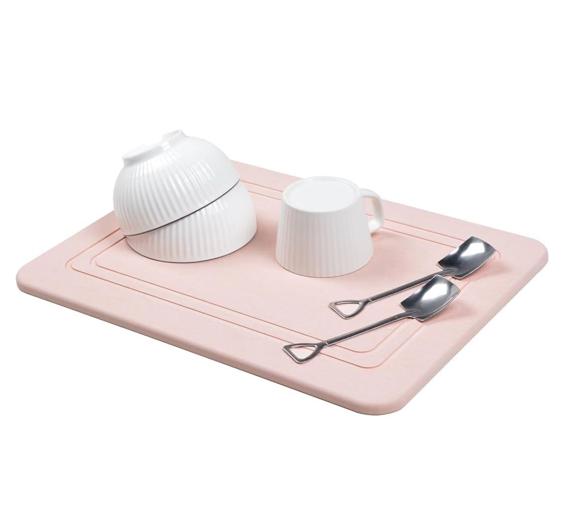 Stone dish dry mat, quick dry dish mat for kitchen counter, non-slip pad, sandpaper, color pale pink, 11.6x15.5, Material natural diatomaceous earth, hand wash only, great for dishes, under pet water dish, pool and hot tub area