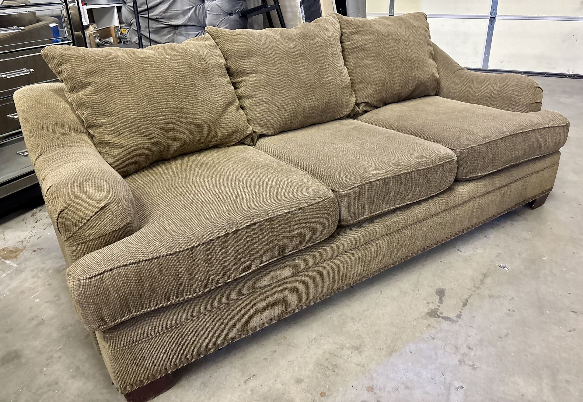 89in. Sofa Couch - Brown/Beige - Nail Head Trim - removable cushion covers for quick cleanup Comfy, deep seating Couch has beef vacuumed, steam cleaned, and disinfected Slip covers laundered. Older couch perfect for kids playroom, basement, or if you pets. Dimensions: 89”W x 39”D x 36”H We are located off Linglestown Road in beautiful Harrisburg Pa. We operate in a first come basis. No Holds Cross promoted We accept cash, cash app, Venmo, and any debit/credit cards through square.