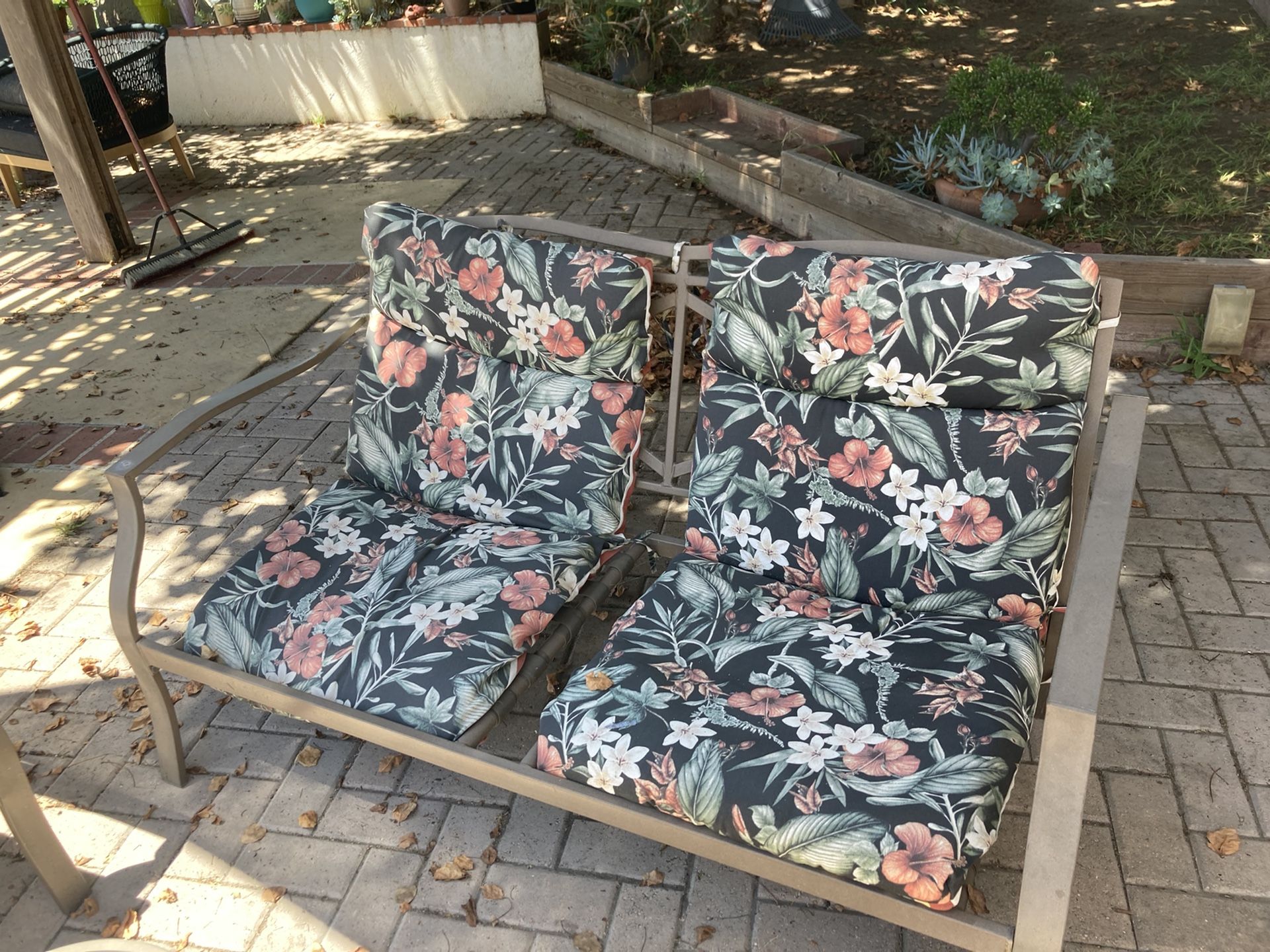 One double seat piece. 2 chairs, and one glass table. They could definitely use a little love, but they are comfortable and not broken at all. They are older, so they have strong metal frames, much better than the flimsy wicker pieces they sell now. $200 obo by Wednesday