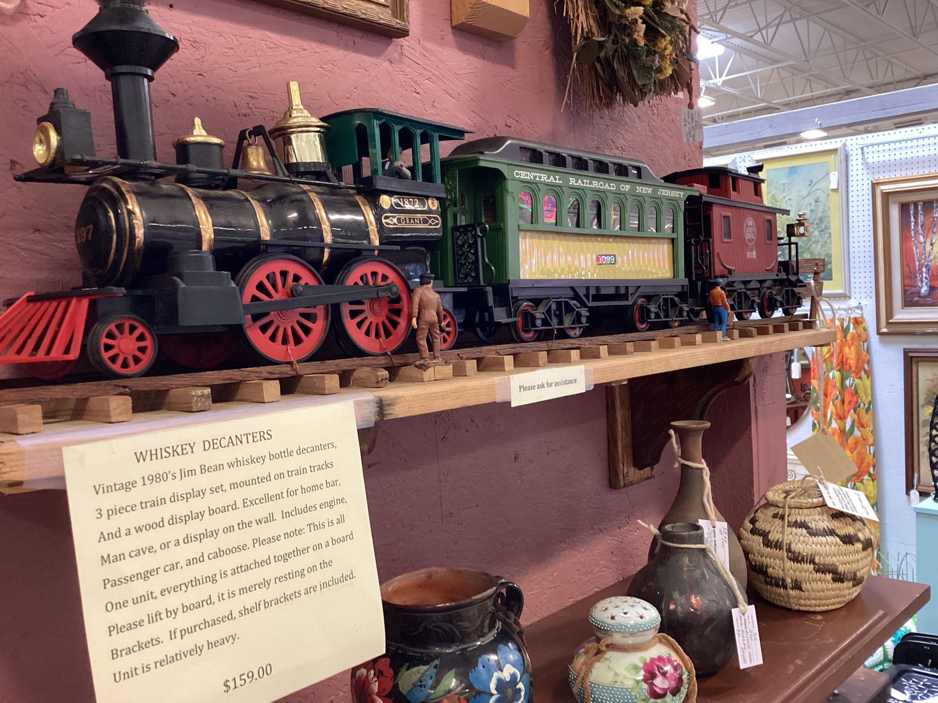 Three piece trains that mounted on train tracks and a wooden display board. All one unit, shelf, brackets included, very heavy! Location in store- Booth 47 Dealer ID 318 Call the Brass Armadillo West store for availability