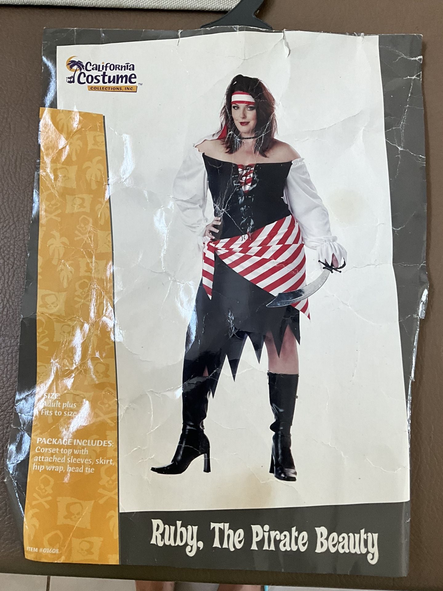 Adult plus; fits to size 22. Includes; Corset top with attached sleeves, skirt, hip and wrap. Head tie not included.