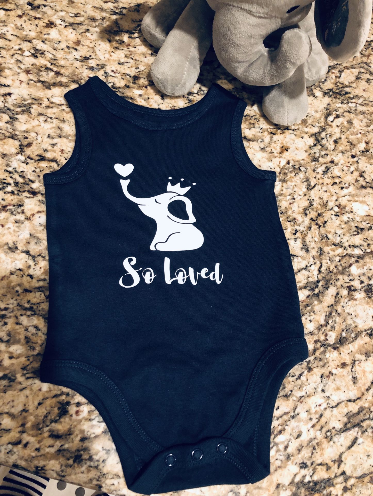 Personalized onesie Any size Handmade So loved elephant design Any size onesie/ sleeve less and with sleeves White/ navy blue/baby blue/pink.