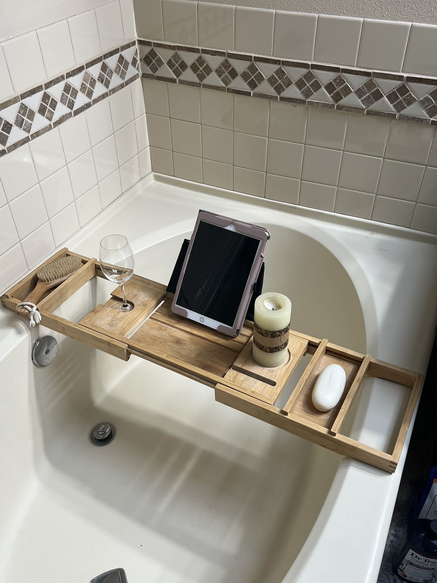 Selling used bamboo bathtub caddy that adjusts from 23.5 inches on the short end all the way to 43.5 on the long end. Has place to hold your favorite drink, book or iPad in the middle. Has a slot for your phone as well and 2 movable trays. One on each end.