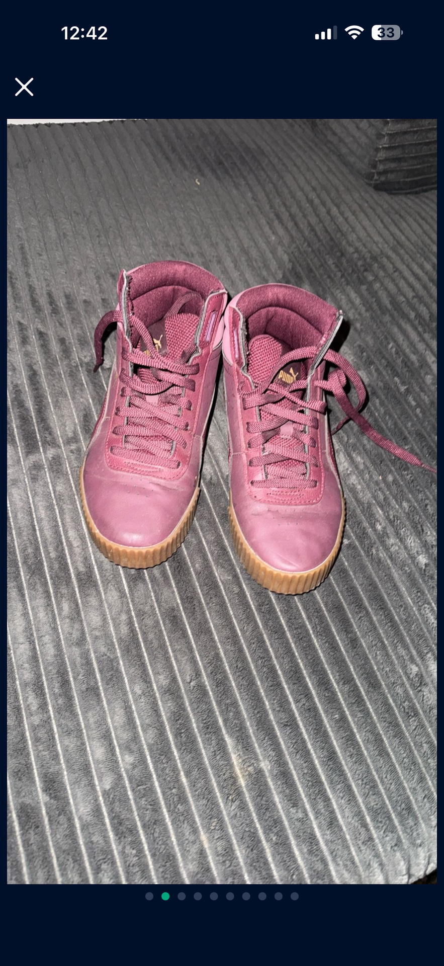 This is a pair of PUMA Women's Carina Mid sneakers in burgundy with a gum sole Used puma’s size 8 1/2 women