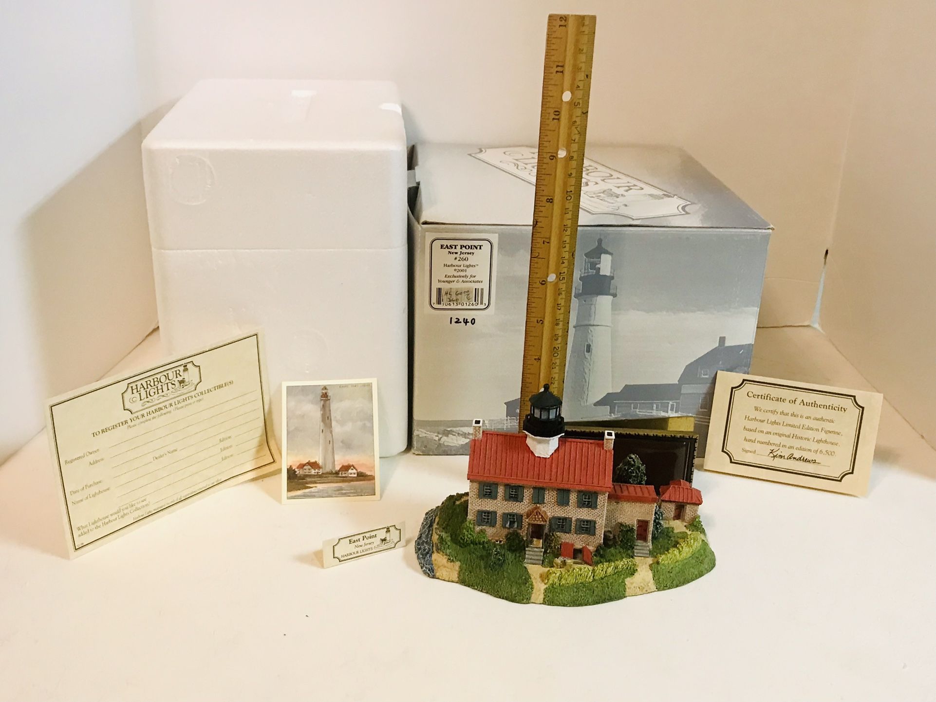 Very nice lighthouse for any display / porcelain / Christmas Village. Comes with the original box and styrofoam insert, certificate of authenticity and label. It also has a Cape May Tobacco card replica. The lighthouse is dated 2001 and numbered 1240/6500. East Point, New Jersey #260. It stands about 5” tall. The base is about 7” x 3.5”. It has no damage. I actually have 10 lighthouses. I will be listing them all. Any lighthouse collectors out there??