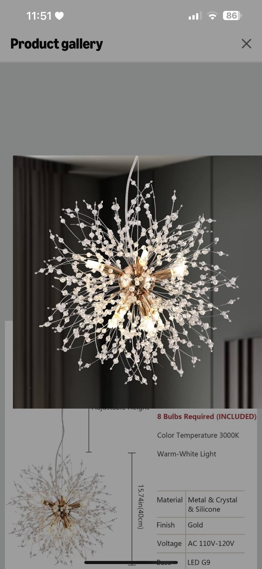 Firework Crystal Chandeliers, 8-Light Gold Dandelion Chandelier Lighting, 15.7" Stainless Steel Small Sputnik Chandelier Lights for Kitchen Island Bedroom(gre270)