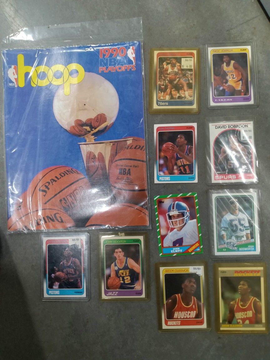 Selling my mint basketball cards Fleer 1988 Dennis rodman John Stockton Hakeem olajuwon Isiah Thomas magic Johnson Charles Barkley and also selling 1989 David Robinson rookie Brian bosworth 1988 rookie John elway 1986 and another Hakeem olajuwon 1987 Fleer.. and throwing a vintage hoops 1990 NBA playoffs magazine and with it asking 400 or best offer