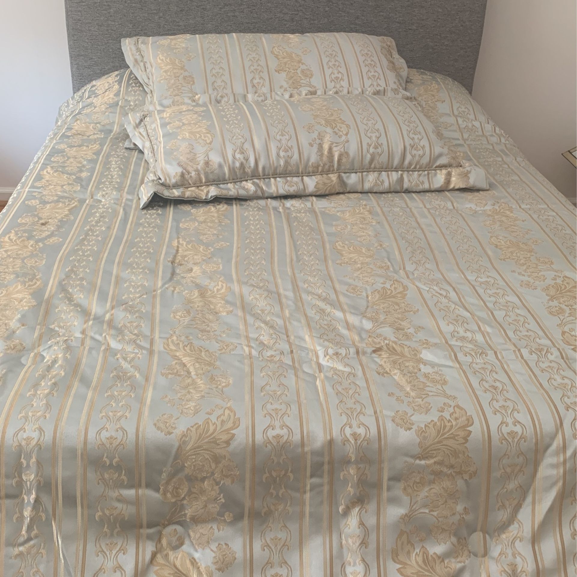 Beautiful king size comforter set. Light blue and gold Comforter and 2 king size pillows and cases.