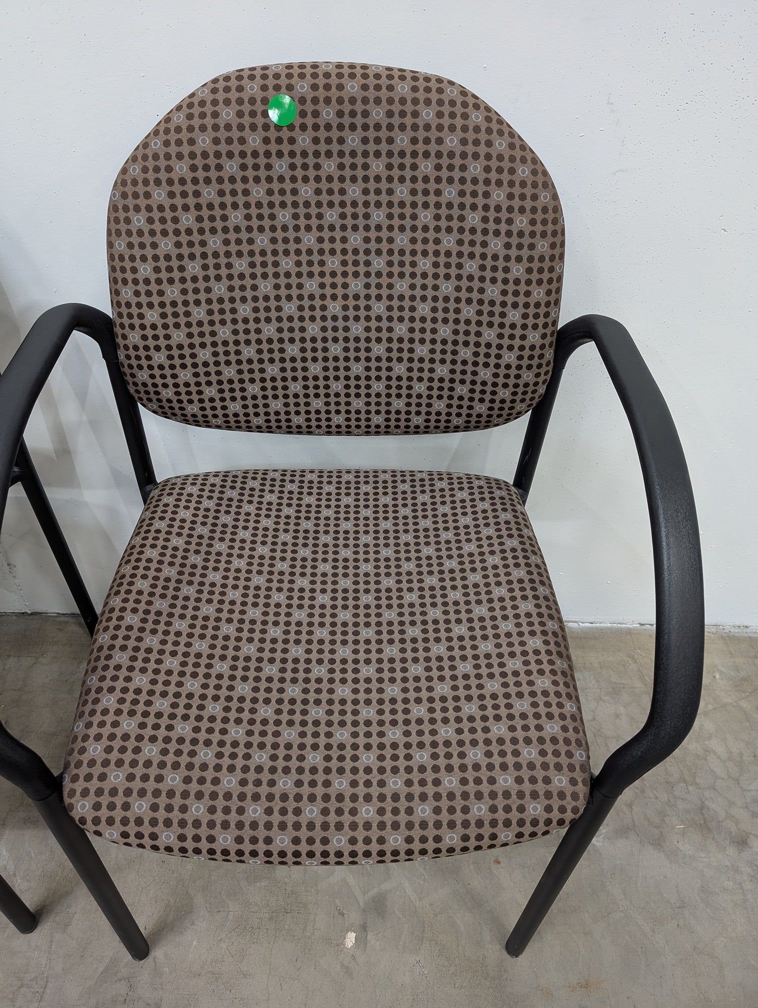 This chair features a brown patterned fabric upholstery on the seat and back. The fabric displays a repeating pattern of dark brown solid circles and lighter outlined circles. It has a black metal frame with fixed black armrests and four sturdy legs.