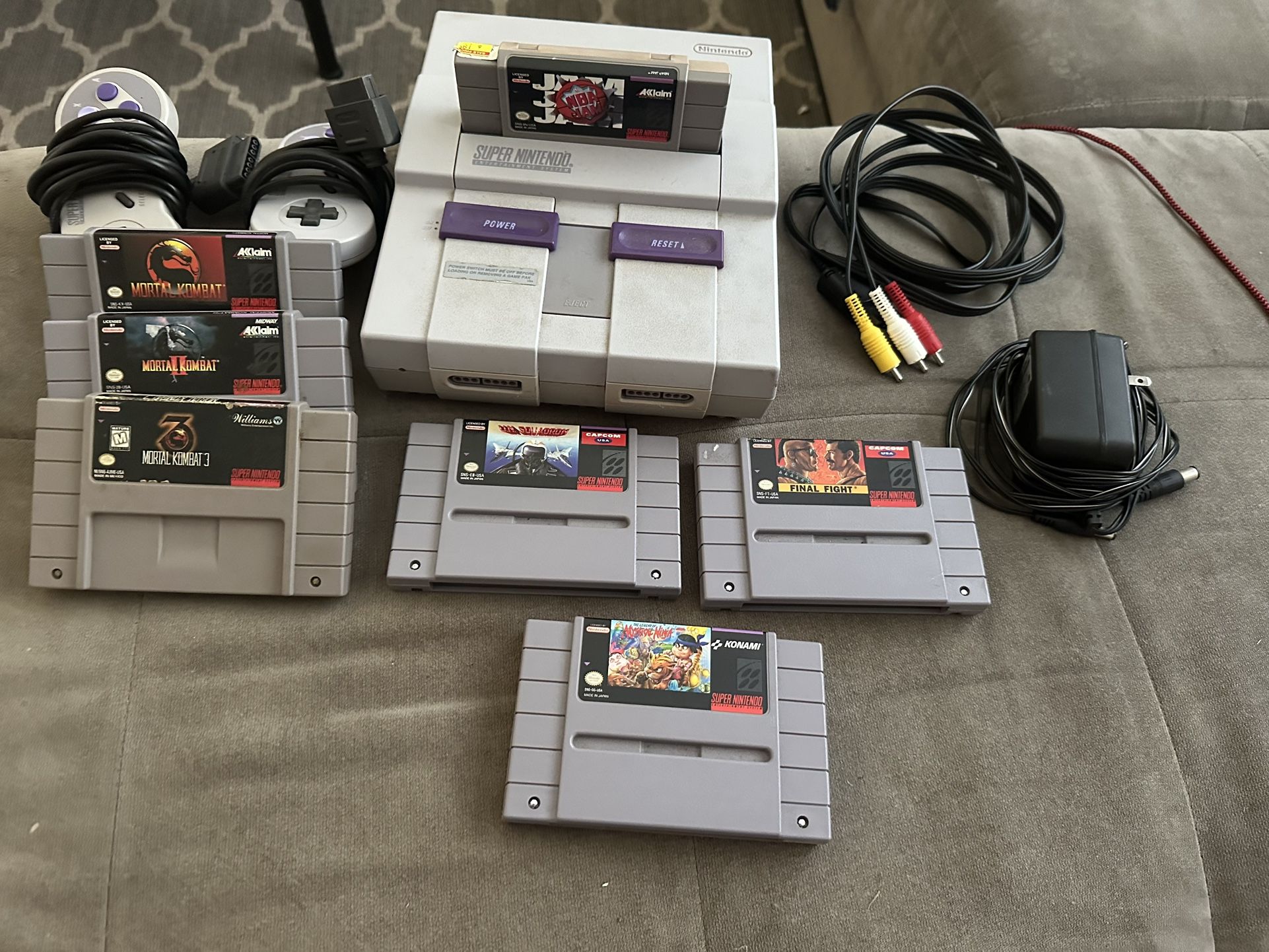 Includes two controllers, power cords, and adapters +7 games, NBA jam, final fight, UN squadron, legend of the mystical ninja , Mortal Kombats1-3)