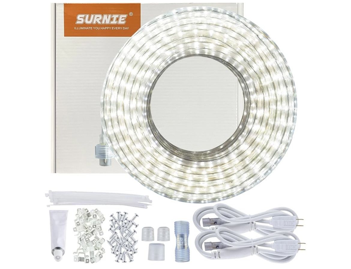 SURNIE 50ft LED Rope Lights Outdoor Waterproof, 110V Flexible Daylight White Bright Lighting Cuttable Connectable