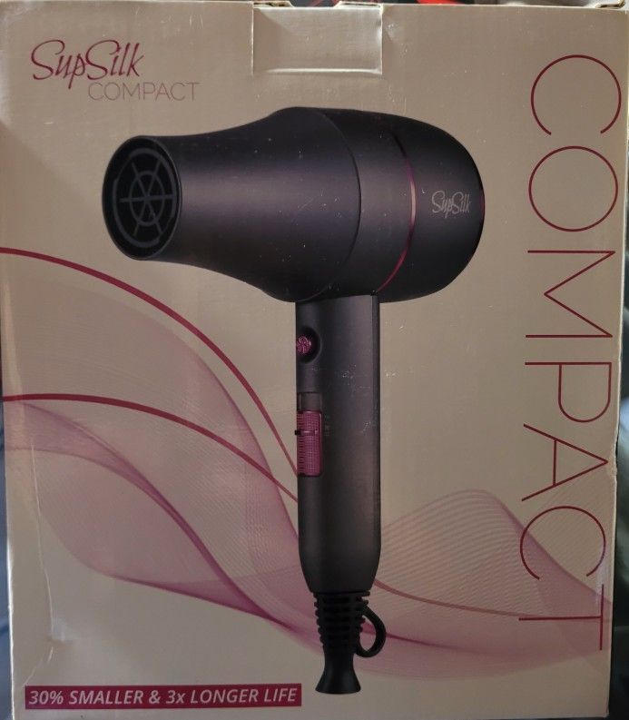 Compact hair dryer. Open box. Brand new. Never used. For all hair types. Styling nozzle, volumizer brush and tooth comb.