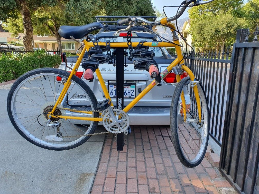 Yakima Hitch Bike Rack - 4 Bikes - for 2" Hitch Receiver Pre-owned with scratches from regular use as photoed. It looks tilted down because my hitch is loose, its not damaged. Missing key cylinder lock but 100% functional without it. I can pick the lock for you. Missing 7 rubber chain straps. Easiest part to find, just look on ebay or amazon, they dont cost much.