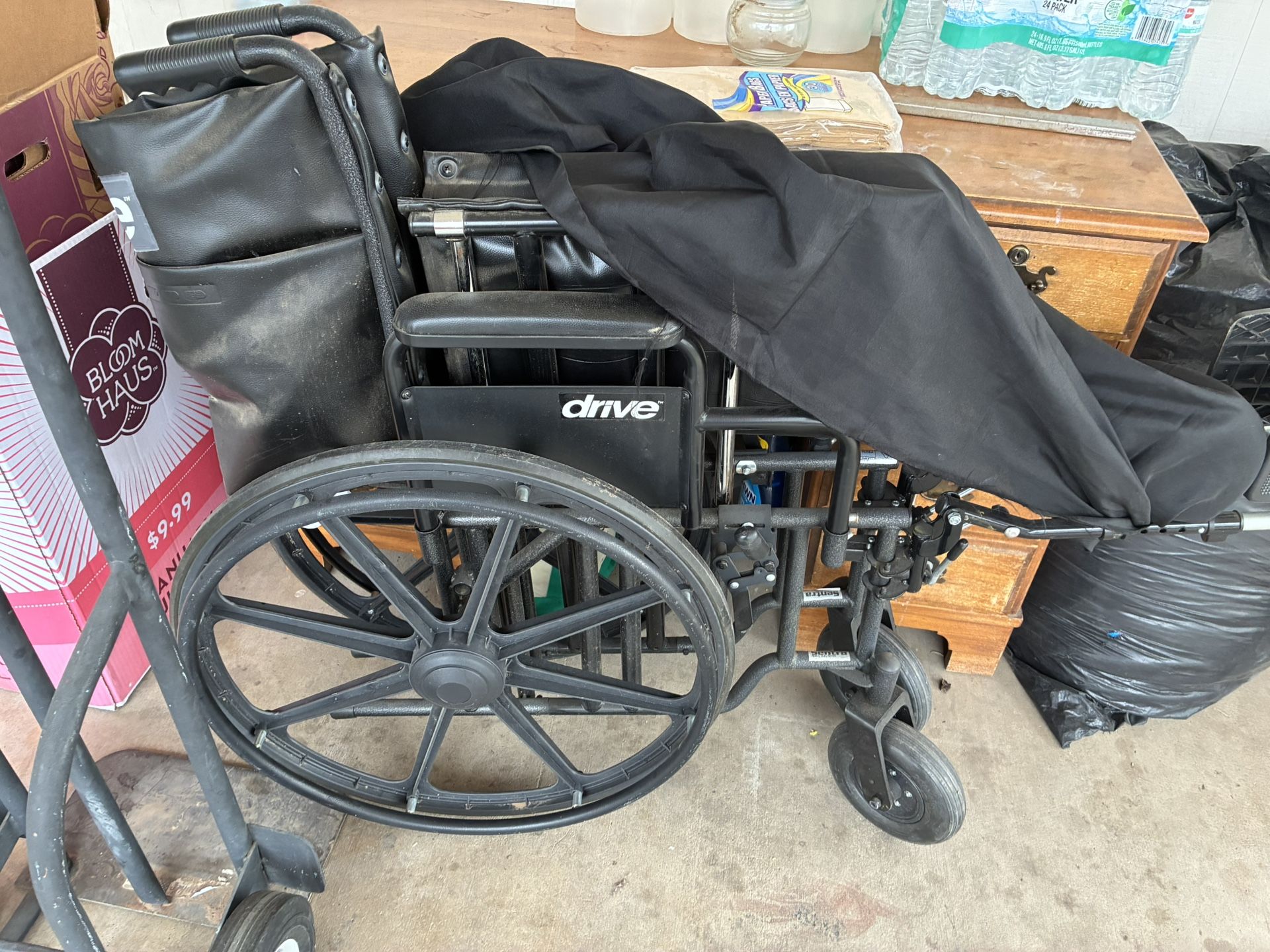Wheelchair is designed for bariatric/plus sized patients and about the width of 2 persons . It has been very well taken care of and barely used