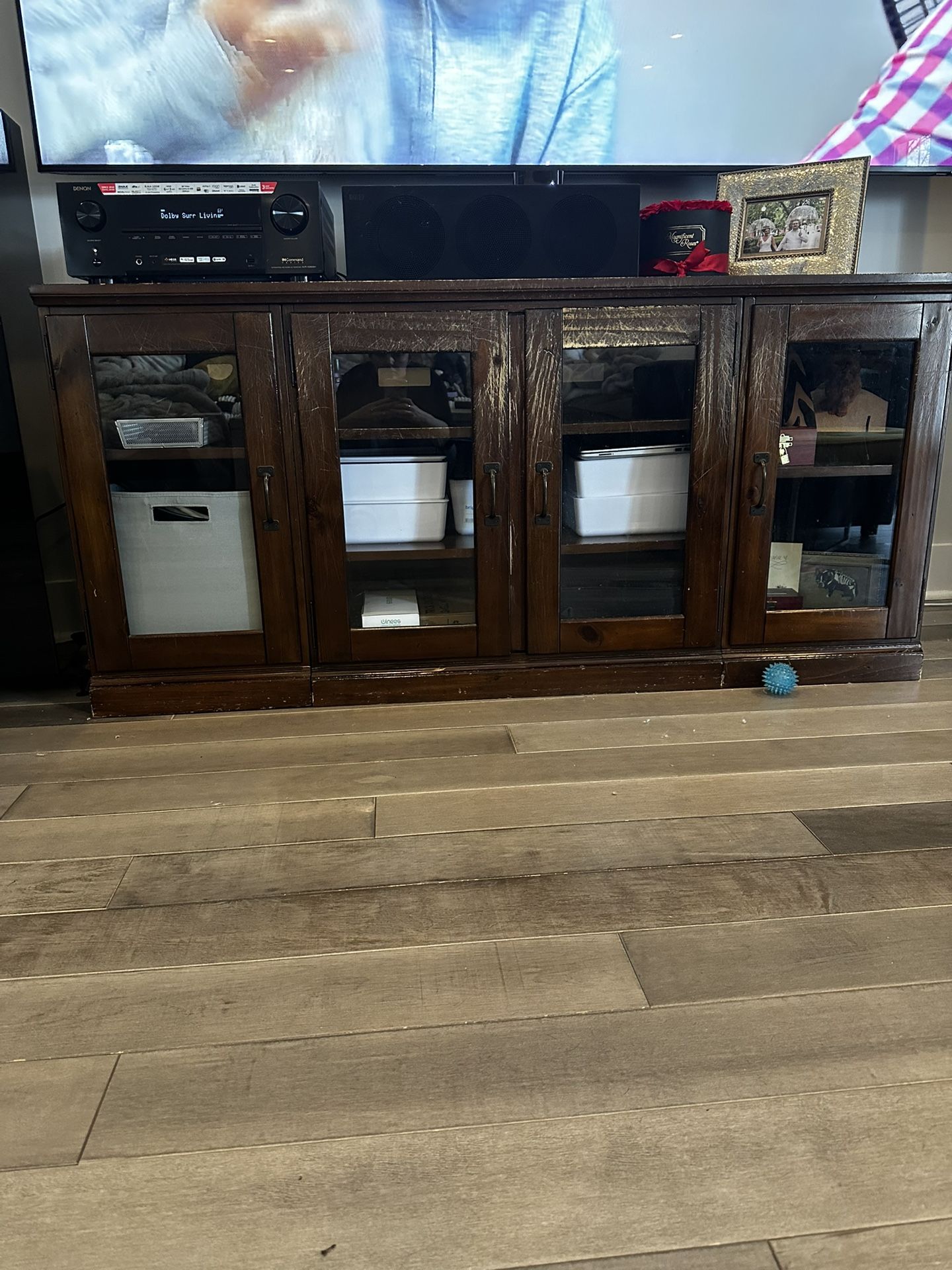 Pottery Barn, Printers collection entertainment center/console storage with Moveable shelves, expertly crafted of real wood! Scratches on some of the pieces, but it appears to be the paint that is scratched, not the wood. The entire piece is 96” wide, but two pieces are moveable and it can be 70” wide. (Please see the last pic for what it would look like with all of the pieces.)Easy to move, with removable top that pulls 4 of the cabinets together. Pick up only. Retail: $3000+