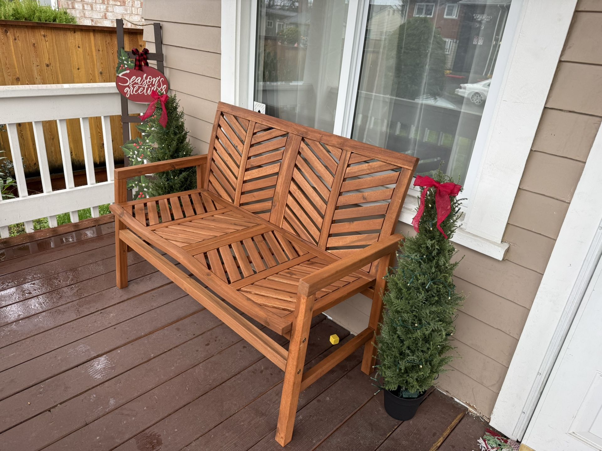 Willing to drop price further. Just make any offer. Brand new Walker Edison 48" acacia wood patio loveseat bench in brown, still new in the original box and never assembled. I purchased two of these, but ended up not having enough space to store the second one, so I’m selling it. Perfect for a patio, porch, balcony, or backyard seating area. Comfortably seats two people. Dimensions are shown in the attached photo for reference. This exact color/style is currently out of stock at Walmart. Details: • Brand new, unopened box • Solid acacia wood • Brown finish • Chevron back design • 48" wide • Outdoor / patio use • Seats 2 comfortably