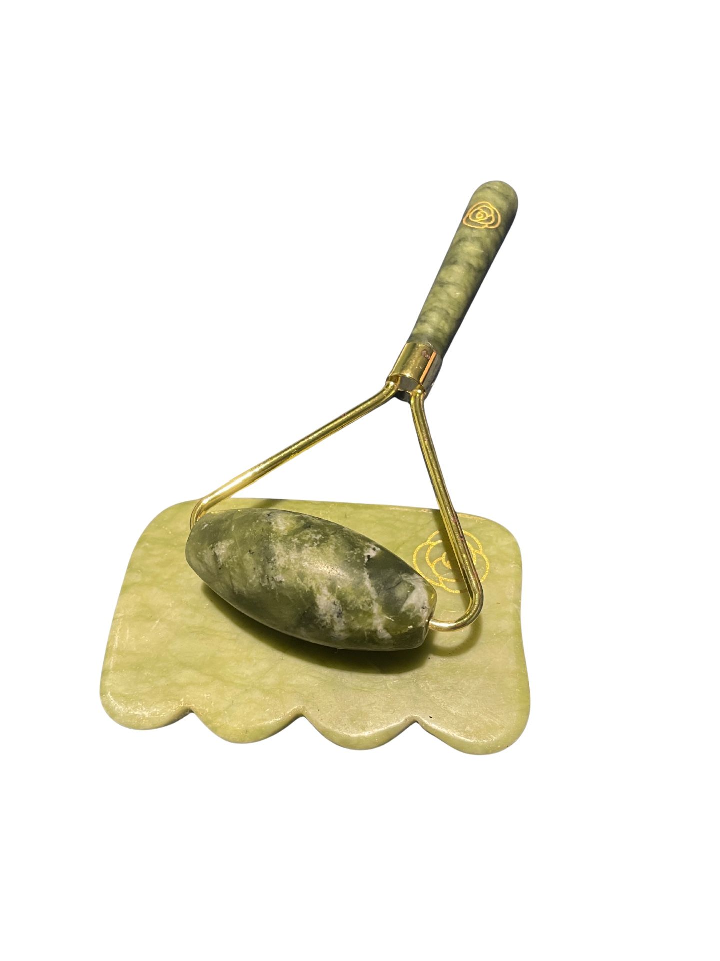 Elegant green facial roller with gold accents. Perfect for skincare routines.