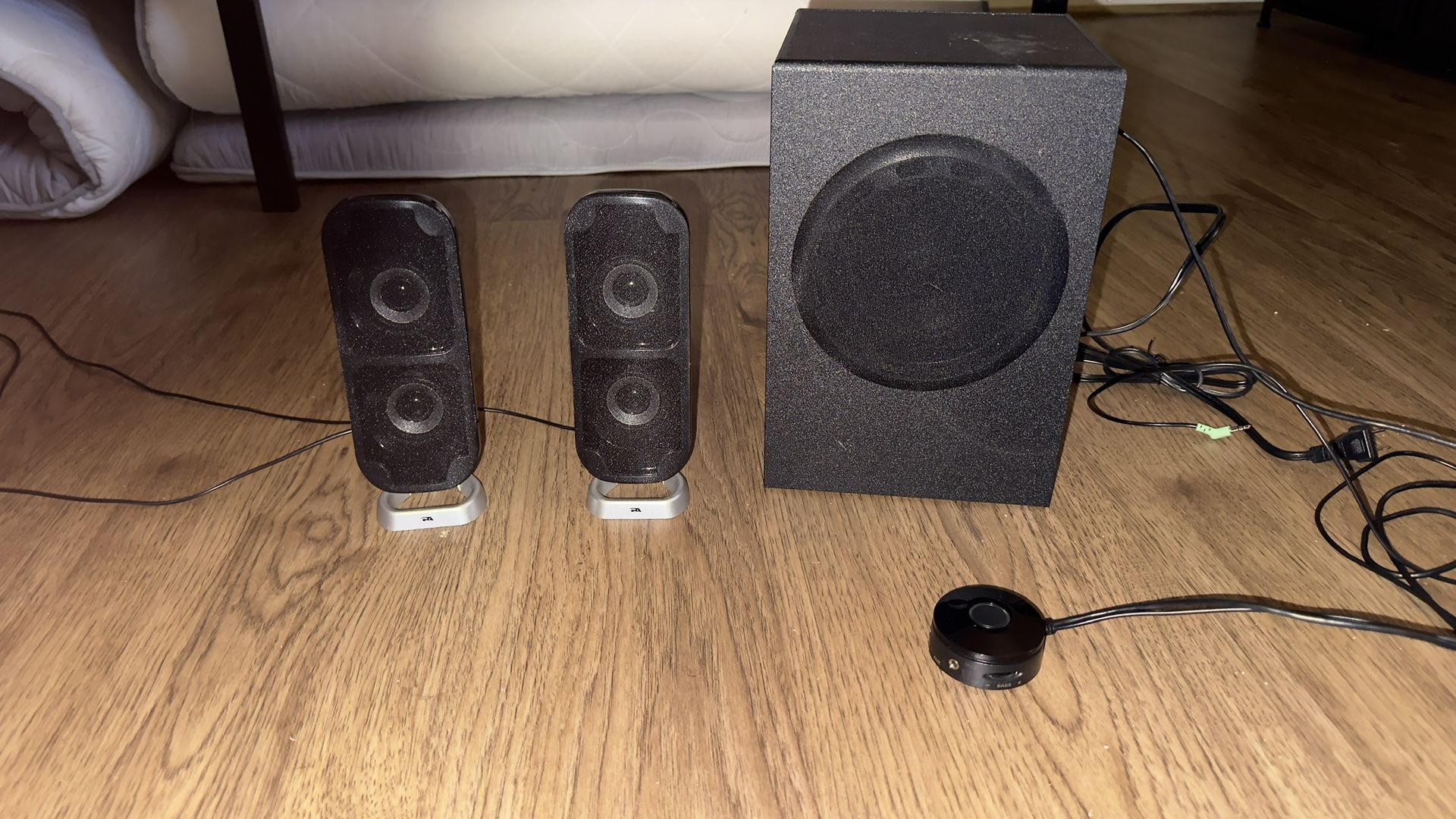 Cyber acoustics 2.1 sound system with 5.25” subwoofer. 80 watts peak power. Connects to source via standard 3.5mm aux. Works great, other than a slight scratching noise when you adjust volume but after that, crystal clear audio and a loud thumping bass. Current price is $80 on Amazon.