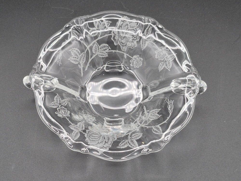 Vintage Heisley footed handled open jellyor jam bowl, etched Rose pattern, in very good condition. The bowl has a small scratch on the bottom of the bowl, see pic, this is the only defect, all else is excellent. Smoke free, pet free home.