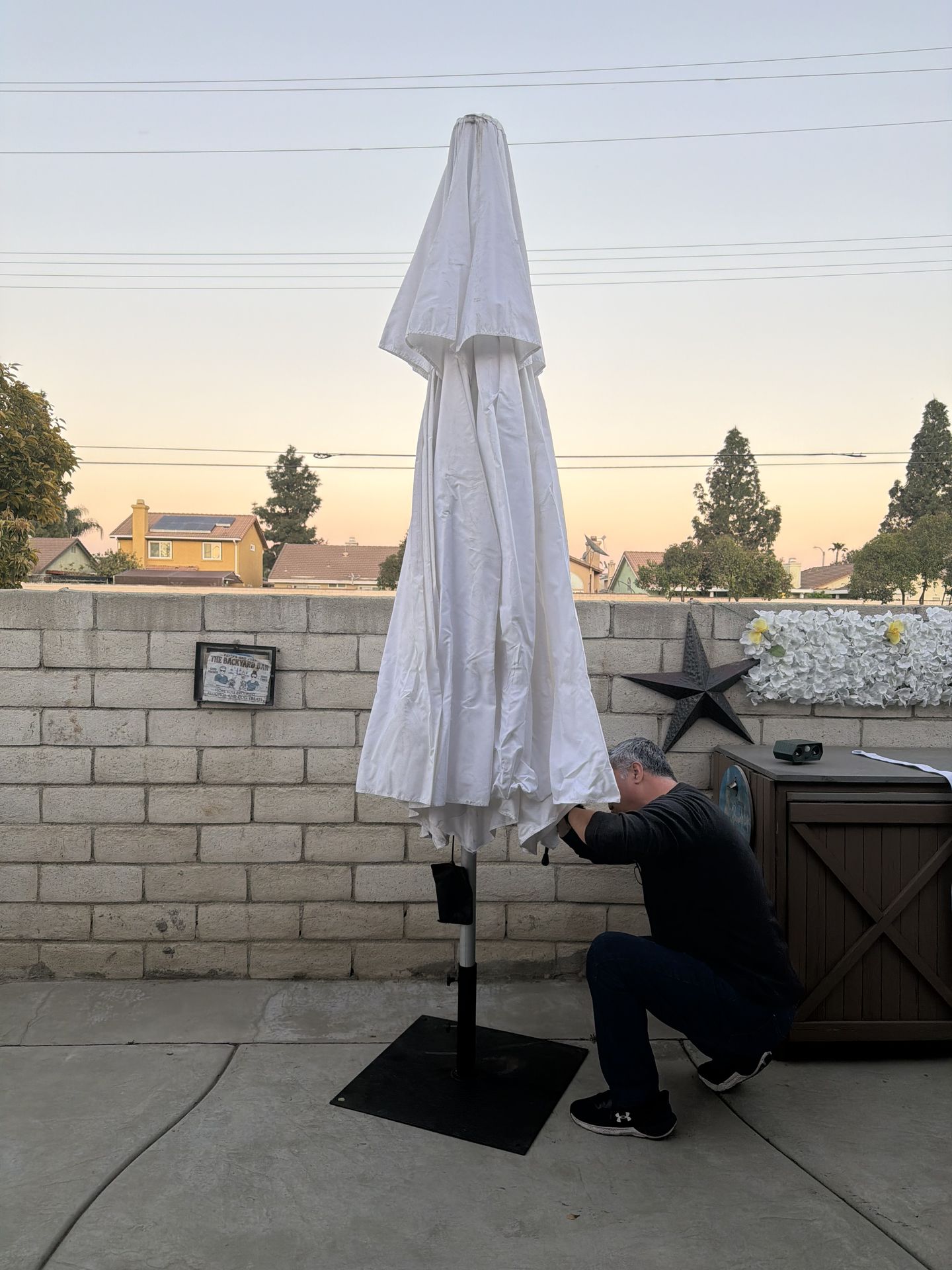 Used once 14 ft hexagon umbrella and 8 ft tall. Lost cover but just dusty.