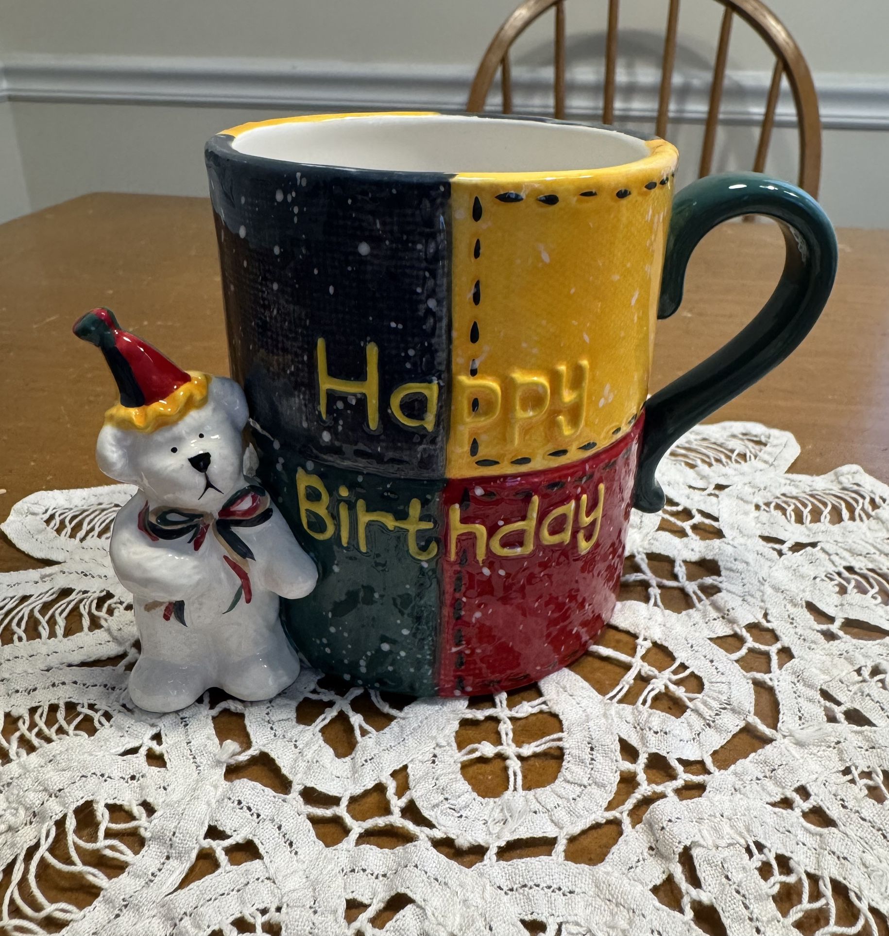 Great condition with no chips, cracks or repairs. Made in 2005, primary colors with raised letters and white speckles. White bear with birthday hat and bow around neck at base. Holds 14 ounces. Pick up S Charlotte/Ballantyne.