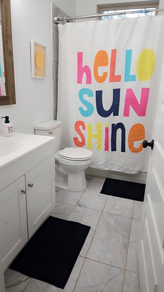 Shower curtain, 2 navy mats, soap dispenser a wall portrait and trash can. Must be able to pick up 75212 area No holds longer than a day.