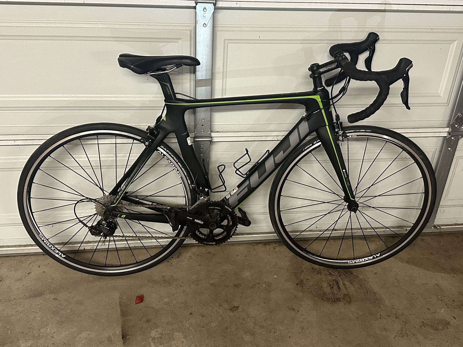 2016, Shimano 105 components, Oval seat and crank, Alex Rims, Carbon. Shimano shoe cleats and indoor trainer.