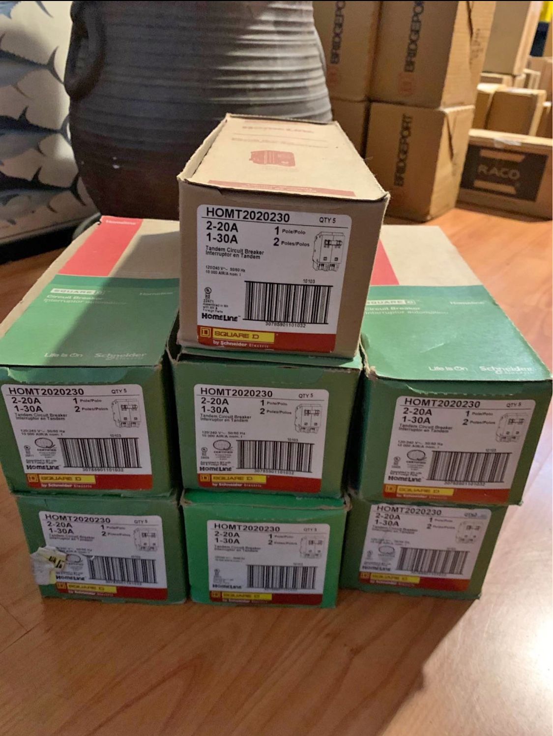 Selling a lot of 35 brand new Square D Homeline tandem circuit breakers. Brand: Square D (Schneider Electric) Model: HOMT(contact info removed)CP Type: Tandem / Duplex breaker Rating: 20/20 Amp, 2-Pole Voltage: 120/240V Condition: New, never installed Quantity: 35 breakers These are genuine Square D Homeline breakers, perfect for residential panels. Ideal for electricians, contractors, or anyone needing bulk breakers. May be in bulk packaging. Please confirm compatibility with your panel before purchasing. Pickup or shipping available. Message me if you have any questions Price Is Firm