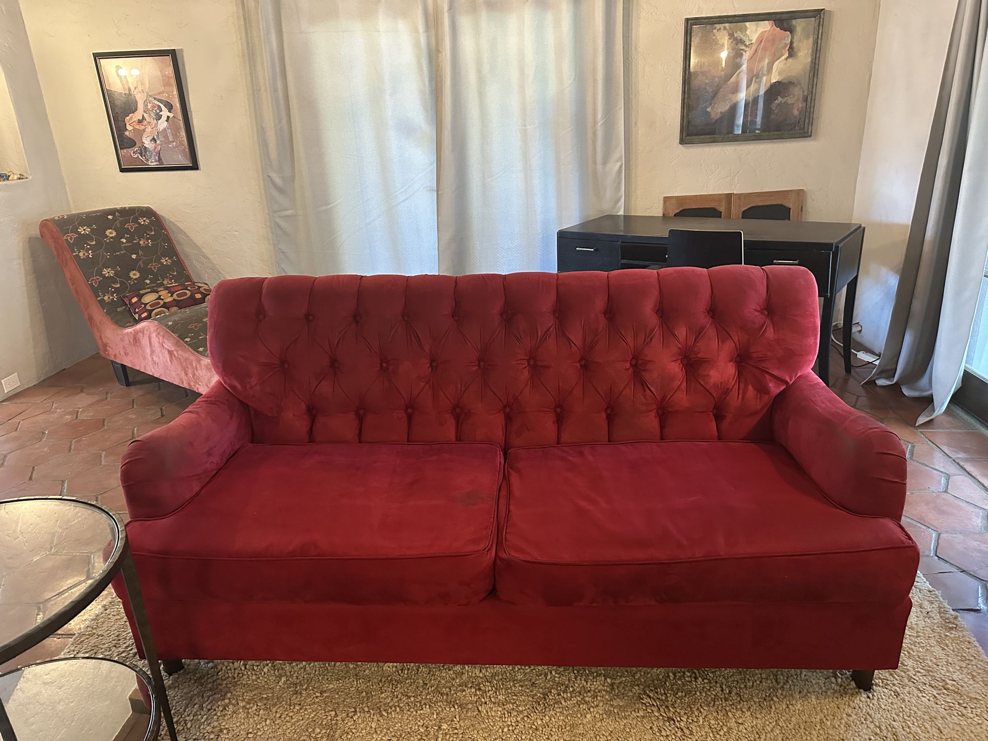 Red Velvet Tufted Sofa – Elegant & Comfortable Beautiful red velvet tufted sofa in excellent condition. This classic piece adds a warm, stylish look to any living room, office, or studio. The deep button tufting and soft velvet fabric give it a timeless, cozy feel. Details: - Color: Rich red velvet - Style: Classic tufted back - Seats: 3 people comfortably - Very sturdy and comfortable - Clean and well cared for - From a smoke-free home Perfect for a living room, reading room, creative studio, or statement piece in an office. Price: $200 Pickup: ONLY