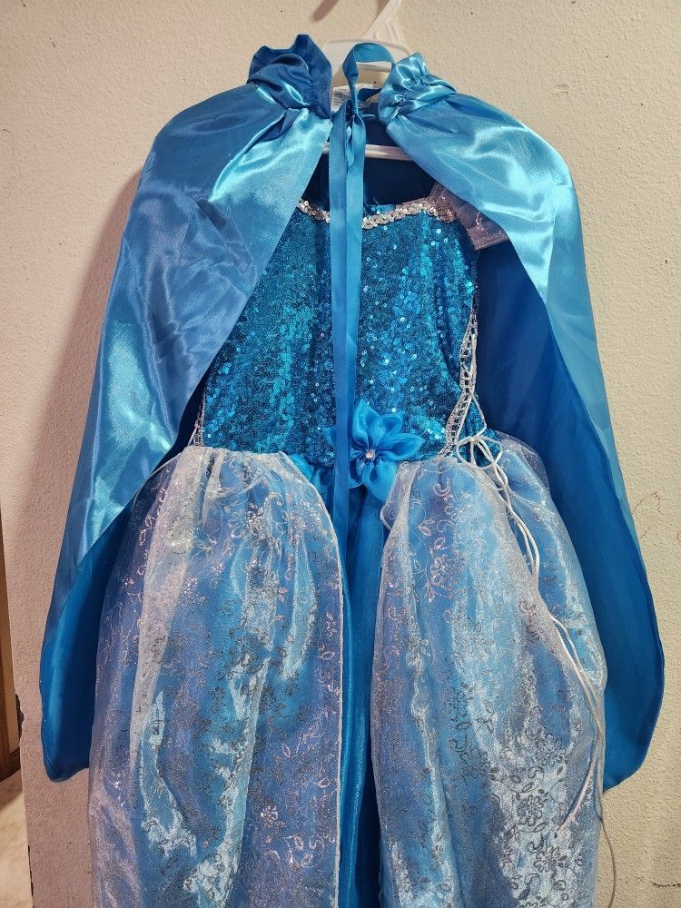 Blue dress with silver accents, it has flowers with silver glitter. It has a blue cape. It was only worn once.