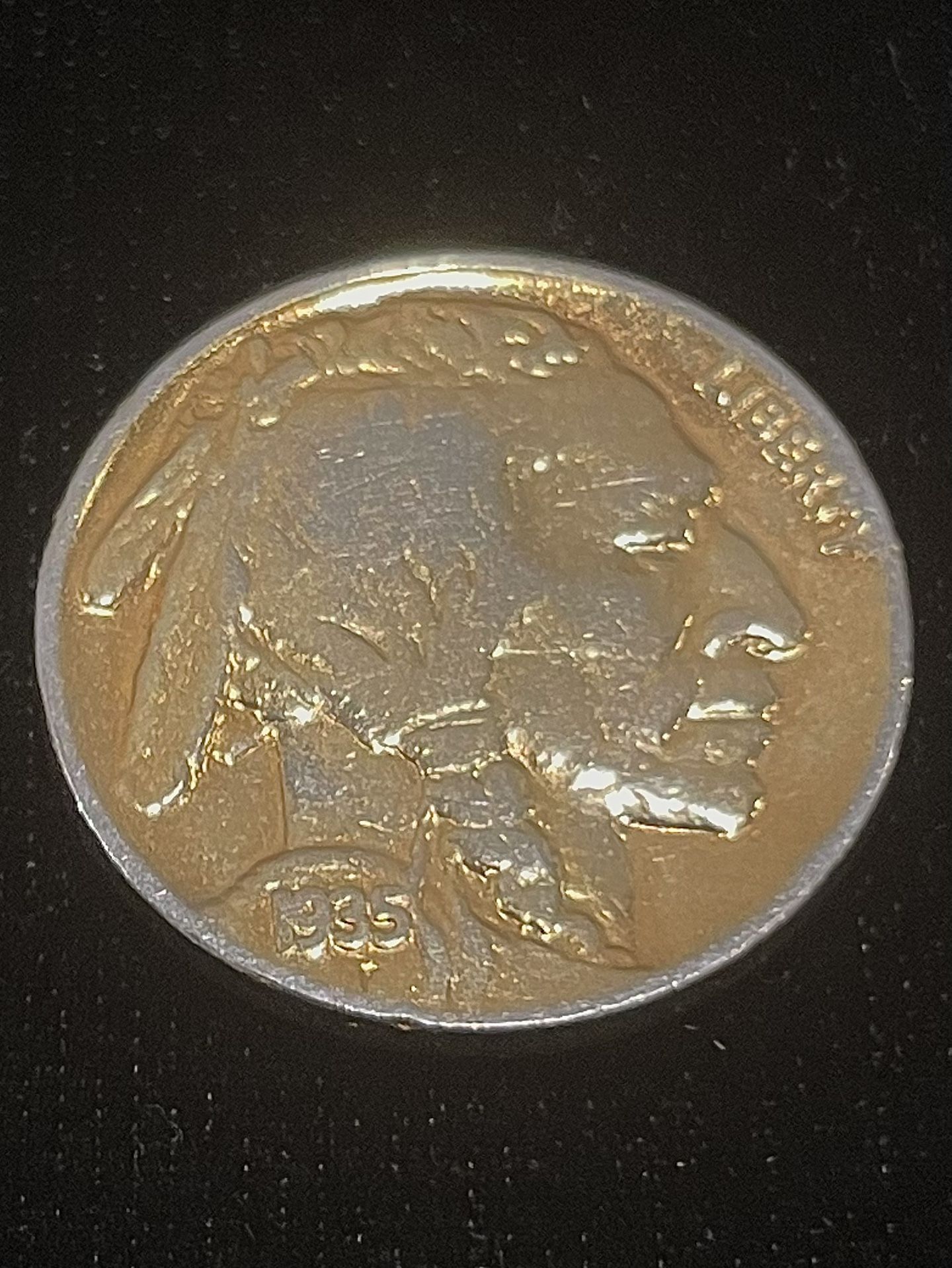 Listed is an authentic 1935 Buffalo Nickel, designed by James Earle Fraser. This classic U.S. coin features a proud Native American profile on the obverse and a powerful American Bison on the reverse. Struck from 75% copper and 25% nickel, the Buffalo Nickel is one of America’s most iconic coin designs. 24k Gold Plated and also showing signs of wear. Specifications: - Year: 1935 - Denomination: Five Cents - Weight: 5.0 g - Diameter: 21.2 mm - Designer: James Earle Fraser - Composition: Copper-Nickel (75% Cu, 25% Ni) 24k Plated This coin shows wear from circulation with visible date and details. A great addition for collectors.i