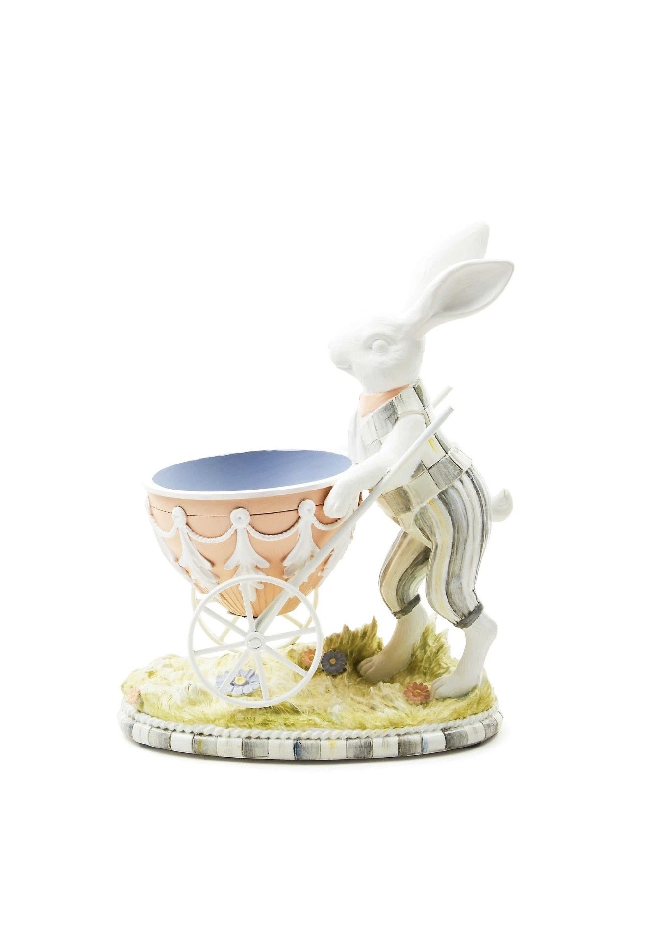 Mackenzie-Childs Cameo Bunny with Cart NEW Stroll into spring with this bunny figure that wears Sterling patterns and pushes an egg-shaped cart decorated with Wedgwood-inspired detailing. Dimensions 3.5" dia., 5" wide, 6.75" long Materials Resin and paper flowers. Pieces may vary due to the handmade nature of each product. Imported. Care and Use Wipe with a soft, dry cloth. Highly Rated FAST Shipper (by next day)